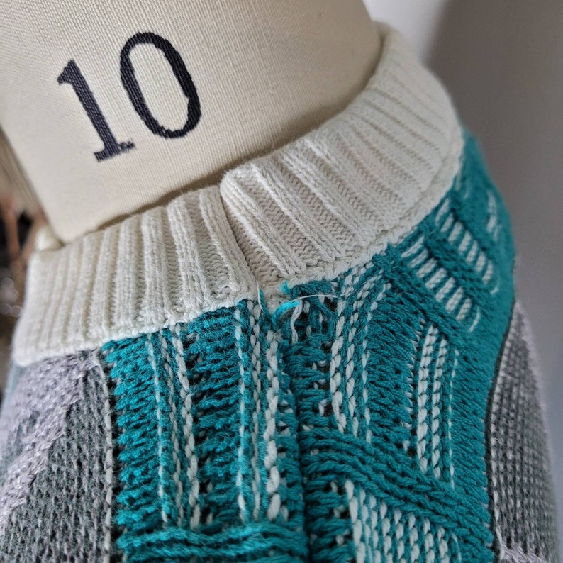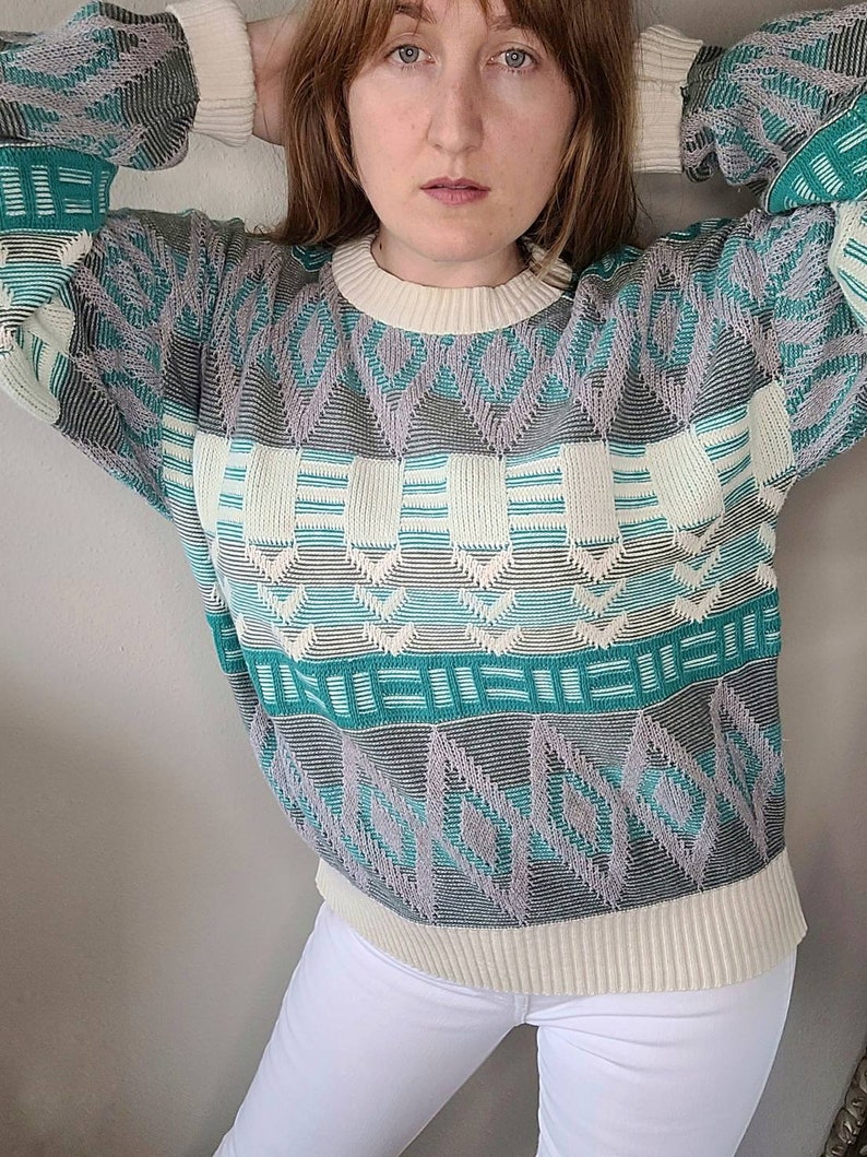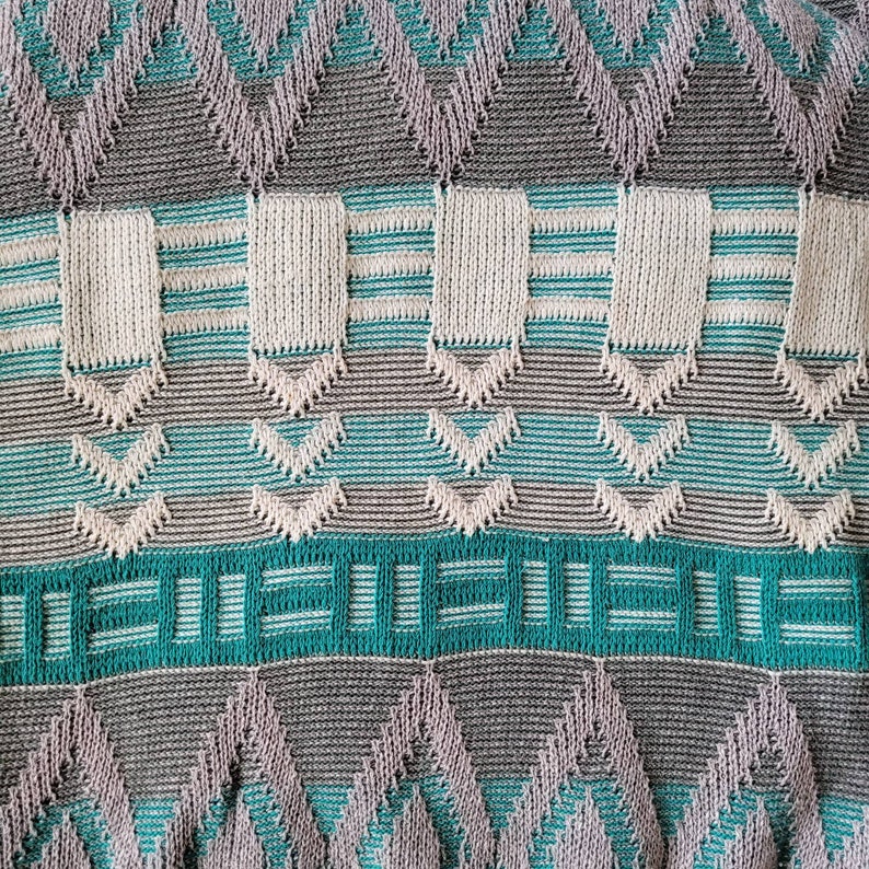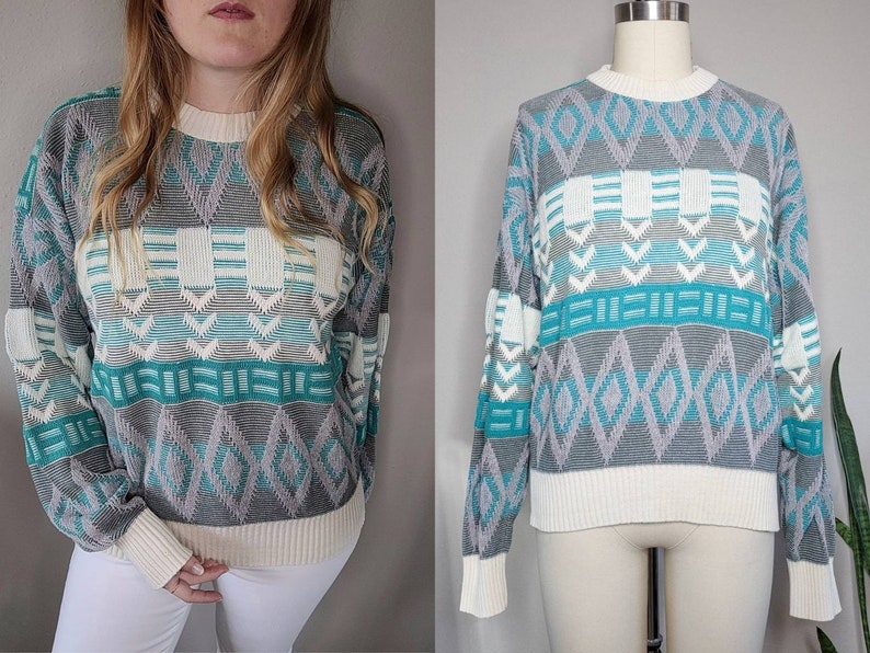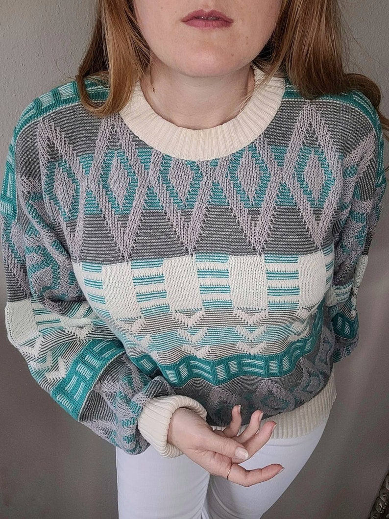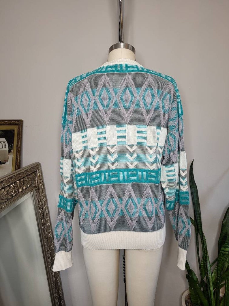 Vintage 70s-80s Coogi Style Teal Geometric Cotton Dad Sweater Striped Grandpa Sweaters