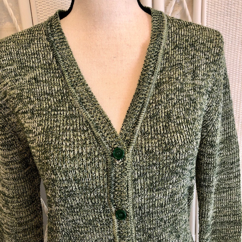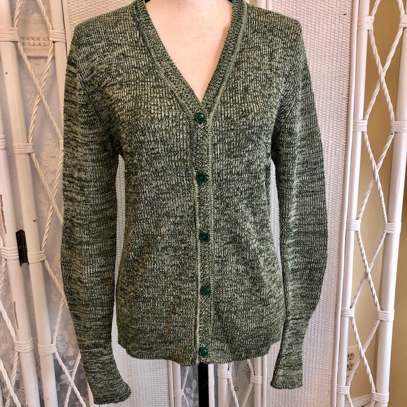 This VINTAGE 1970s Cardigan Green Marled Knit Vneck Sweater fits like a well-loved favorite. The soft-washed, garment-dyed fabric brings extra coziness to your wardrobe while the relaxed fit makes it an excellent daily choice.